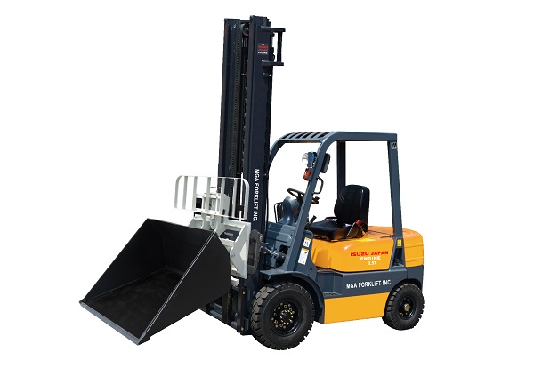 Xe Nâng MGA gắn gầu xúc đổ là mẫu xe thông dụng cho loại hình sản xuất như: Nông sản, cám, thực phẩm, xi măng, hạt nhựa.